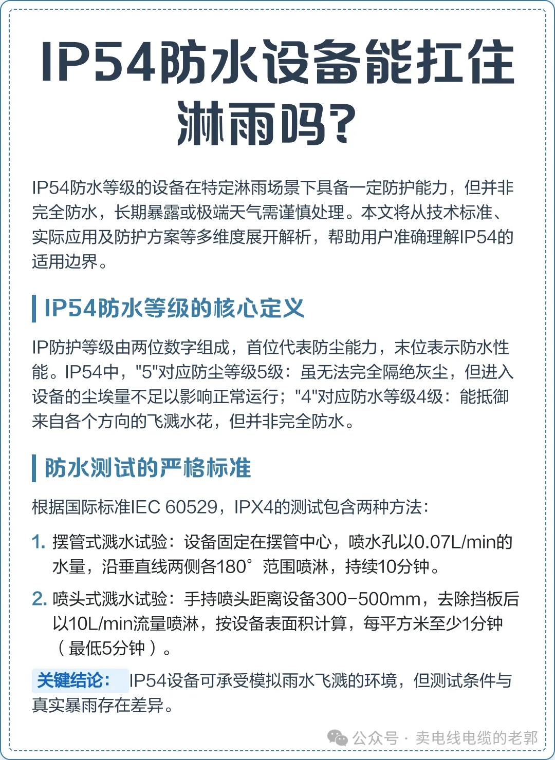 :《Q∕25 HBZC 008-2025 ...pdf》中提到的“电缆防水试验”(将电缆浸泡在水下1米深处7天)是一种静态防水测试,与IP54的动态喷水测试是两种不同的概念。普通电力电缆通过静态浸水测试是可能的,但未必能通过动态喷水测试。